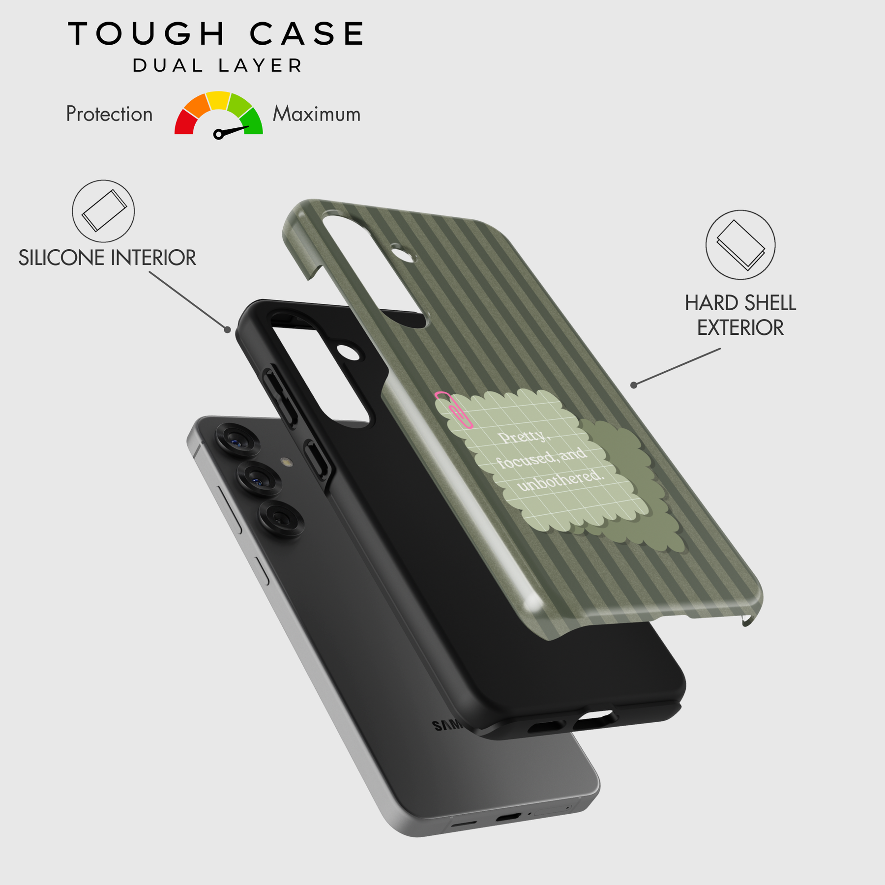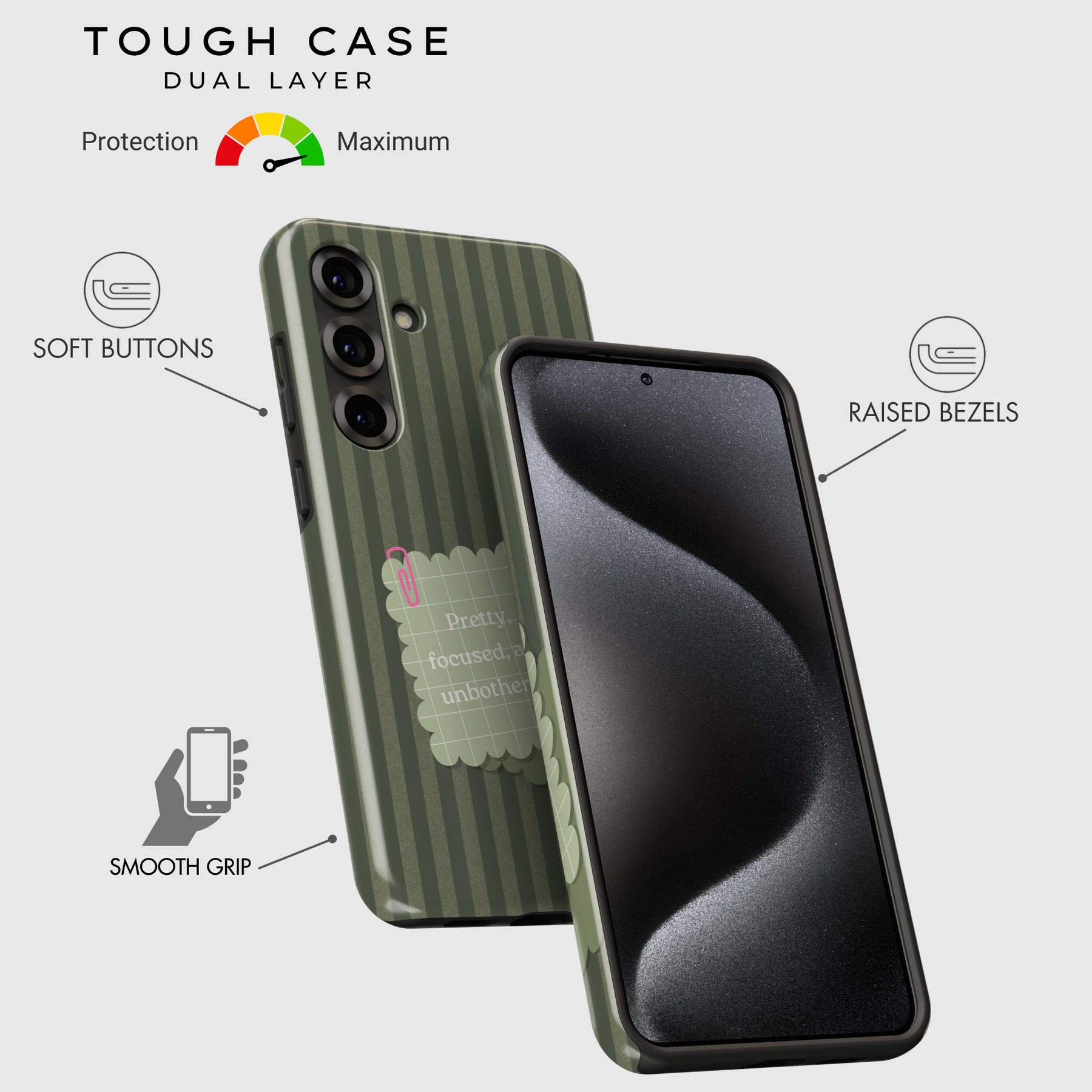 Tough Case: Provides superior defense with dual-layered protection (soft silicone interior + hard shell exterior), safeguarding both the screen and camera. Perfect for those seeking maximum durability while maintaining a fashionable look.